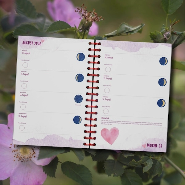 Lässt sich flach öffnen und bietet viel Platz für Termine, Zyklusbeobachtungen, Gedanken, Notizen und alles, was dir sonst durchs Herz und den Kopf geht. - Robuste Verarbeitung